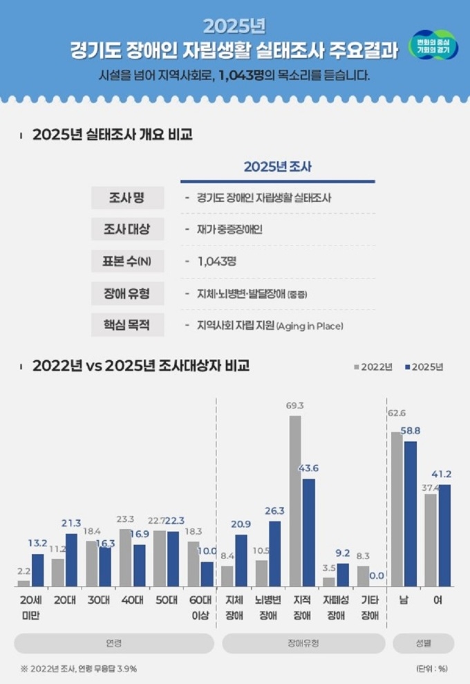 경기도와 경기복지재단은 도내 재가 중증장애인의 생활 실태와 자립 욕구를 정밀 진단한 ‘2025년 경기도 장애인 자립생활 실태조사’ 최종 결과를 3일 발표했다.