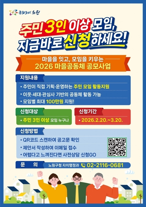노원구민 또는 직장, 학교 등 생활권이 노원구인 3인 이상의 모임이면 지원할 수 있다. 심사를 거쳐 최종 선정되면 오는 5월부터 11월까지 활동을 진행한다. 선정 결과는 4월 10일 구 홈페이지를 통해 확인 가능하다. 행정 서류 작성이나 구체적인 계획 수립에 어려움을 겪는 모임은 필요에 따라 사전 상담을 받을 수도 있다.